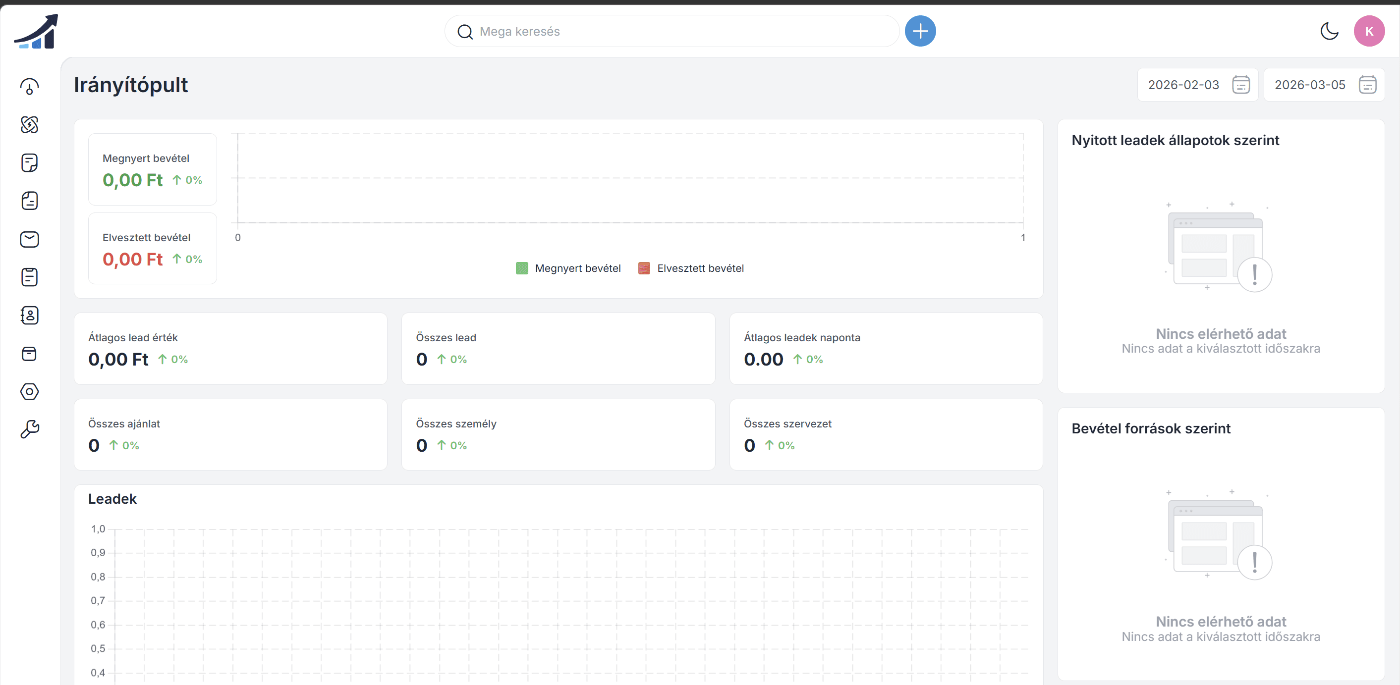 A DrCRM használatához először be kell jelentkezni az Admin Panelbe, ahol a belépés után azonnal megjelenik a Irányítópult felülete. A dashboard áttekintést ad az értékesítési folyamatokról és a legfontosabb CRM-adatokról különböző grafikonok és statisztikák segítségével.