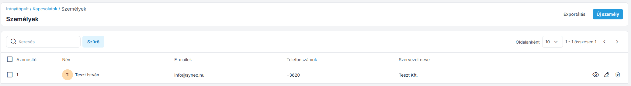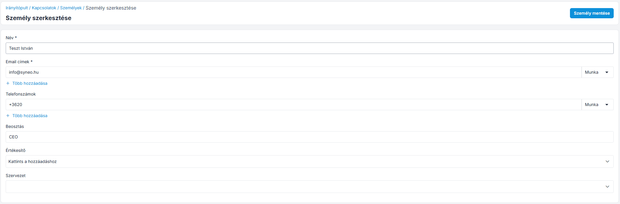 Ezután kattints a Szervezet mentése gombra és létrejön a Személy adata.