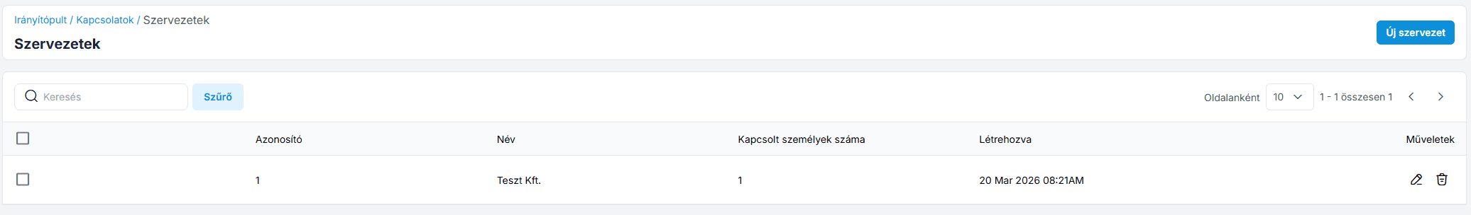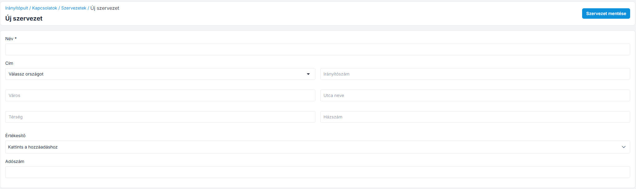 Szervezet létrehozása a CRM rendszerben