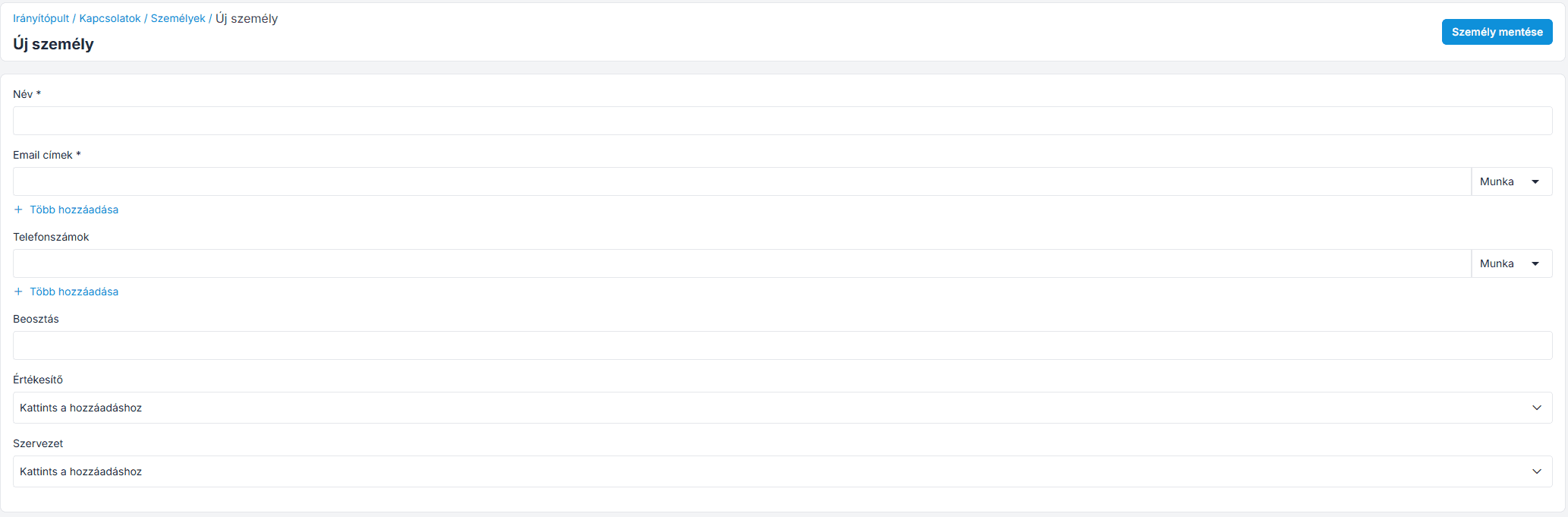 Email címek – Add meg a személy email címét; a legördülő listából kiválaszthatod, hogy munkahelyi vagy privát email